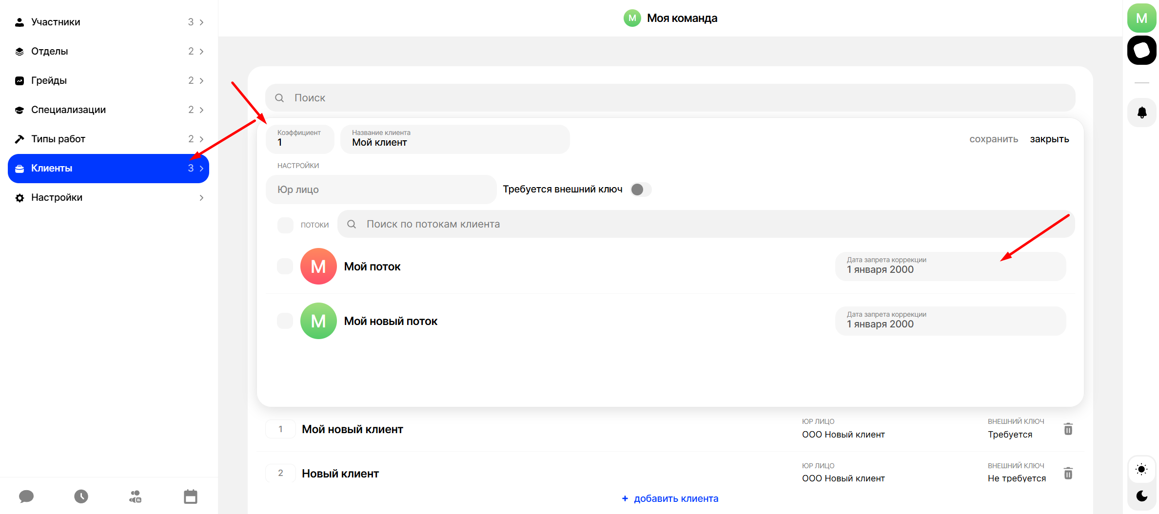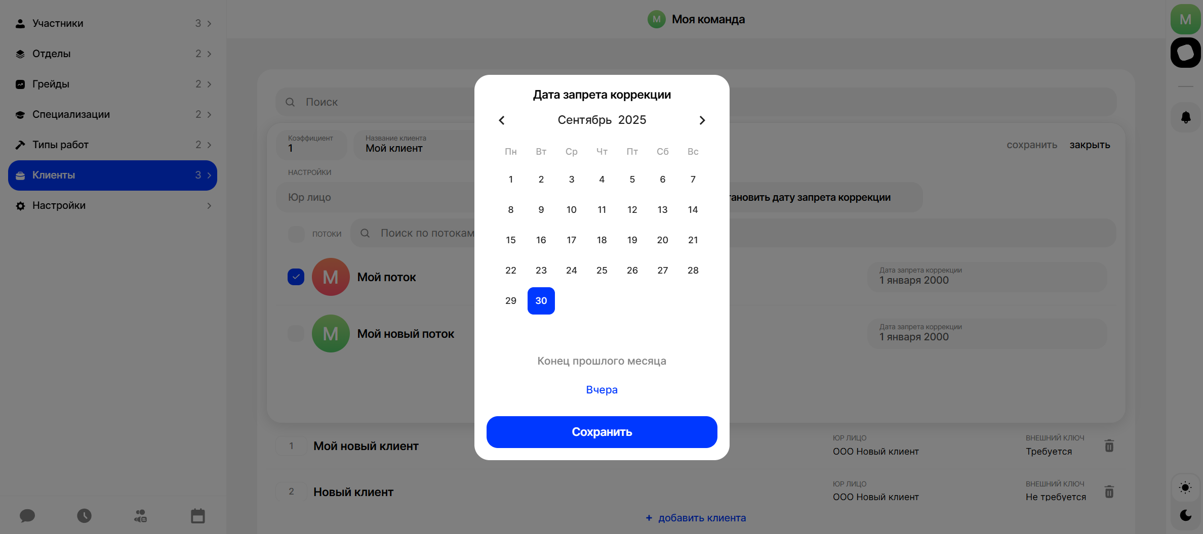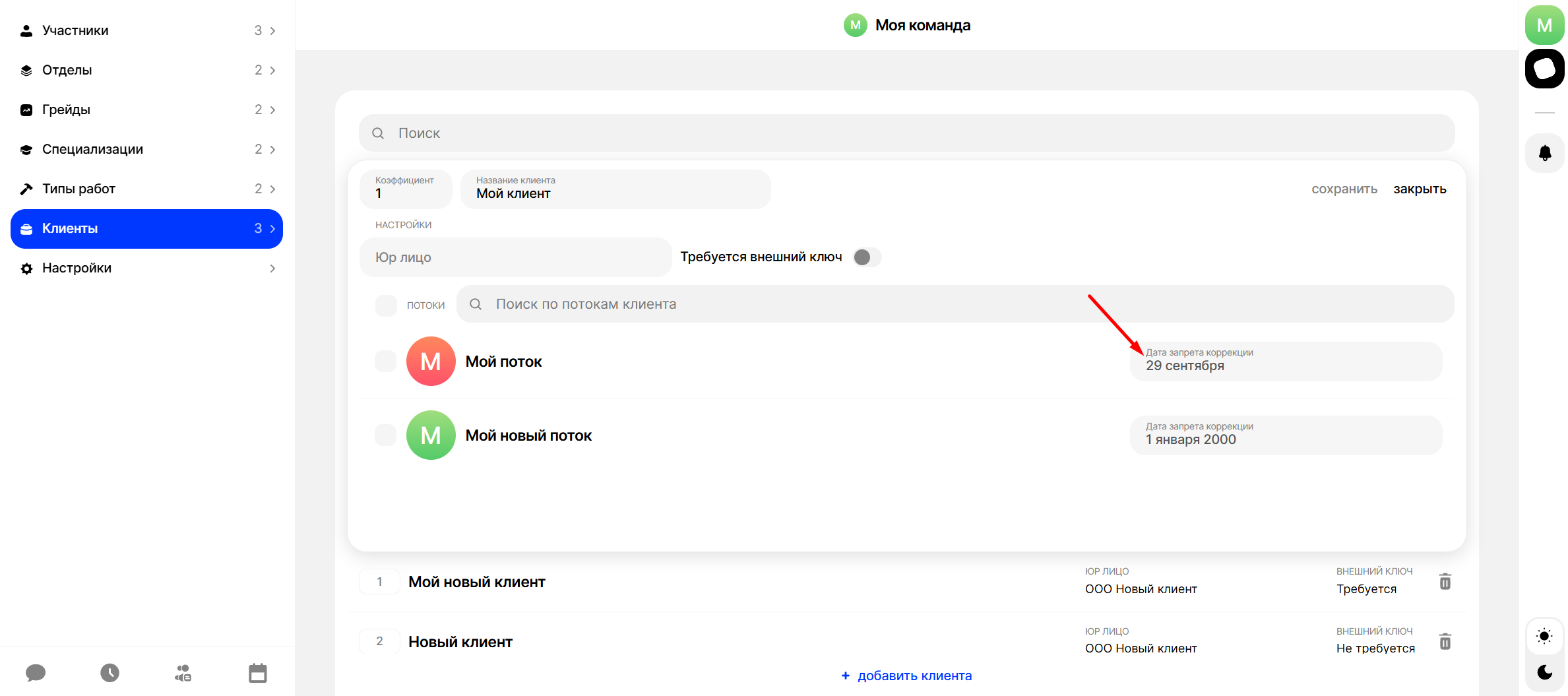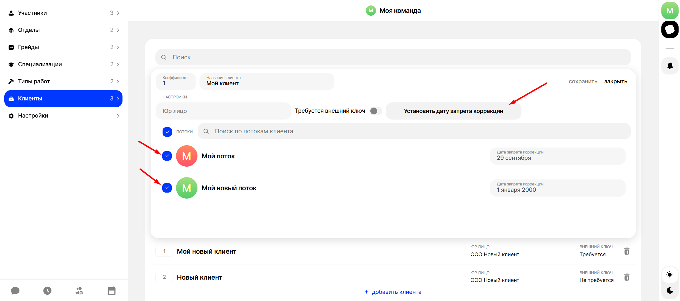 Перейдите в настройки команды, в раздел "Клиенты", выберите клиента поток которого вам нужно "заморозить" и нажмите в потоке на опцию “Дата запрета коррекции”: