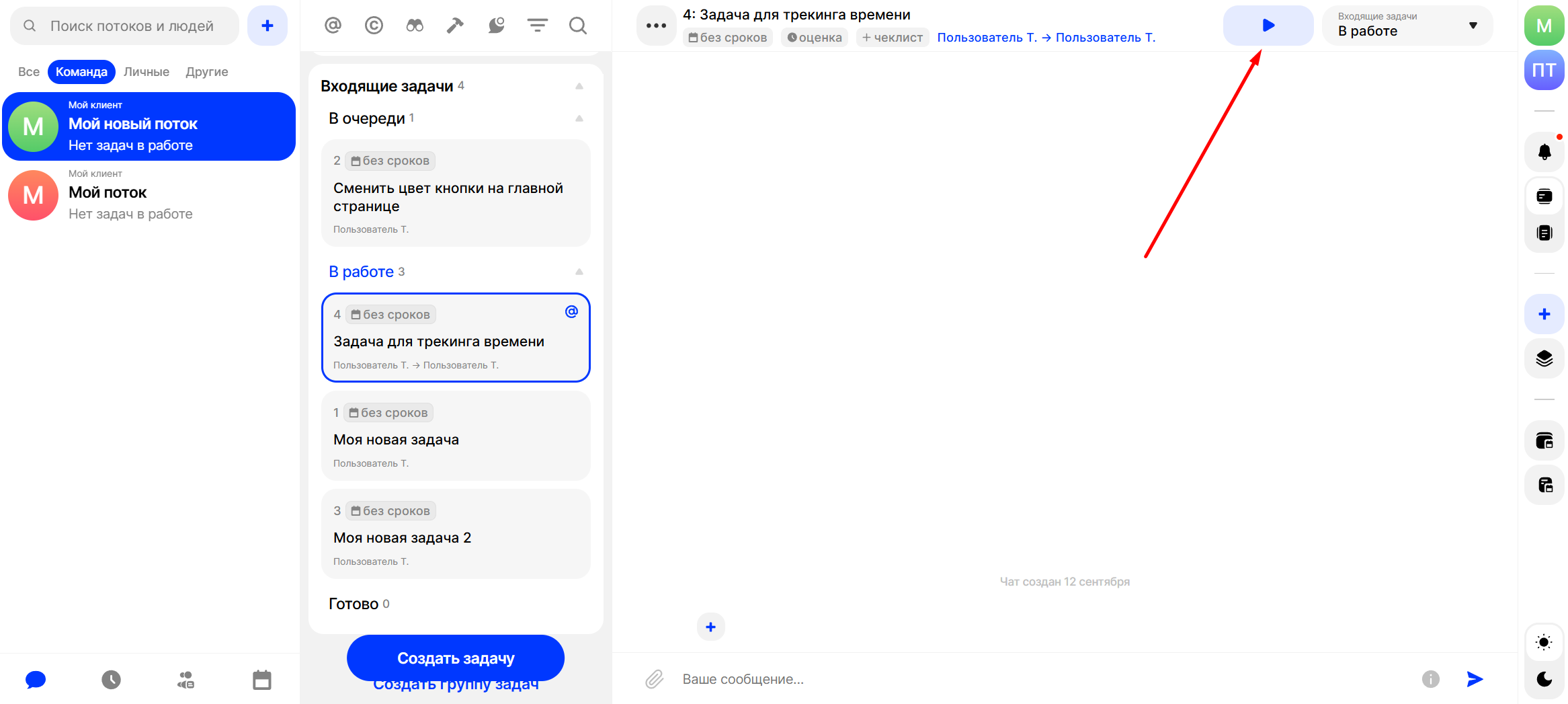 Откройте задачу. В верхней панели задачи нажмите на кнопку плей: