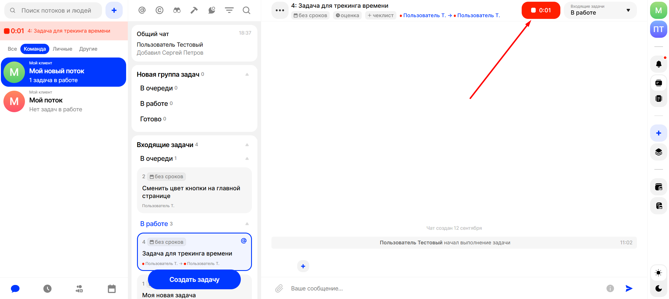 По завершению работы нажмите на кнопку стоп. Трекинг будет остановлен и записан в статистику команды.