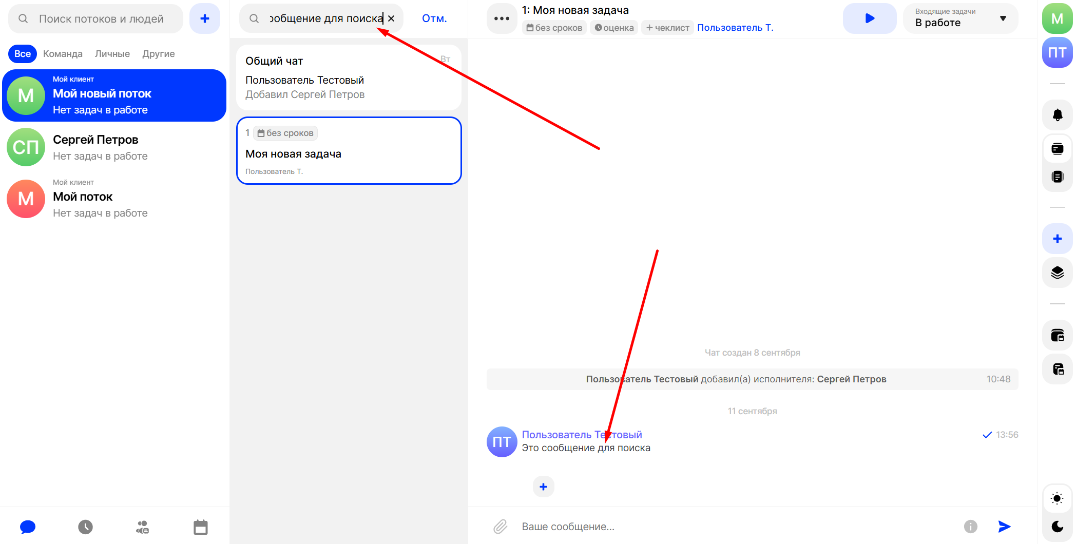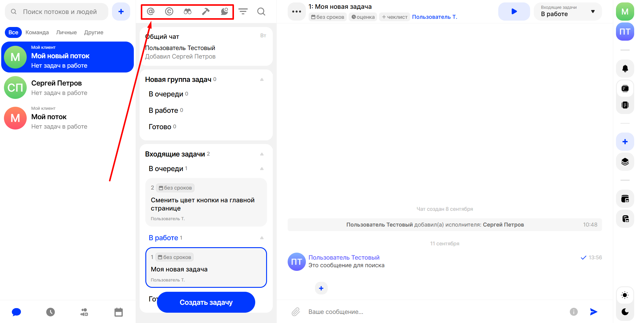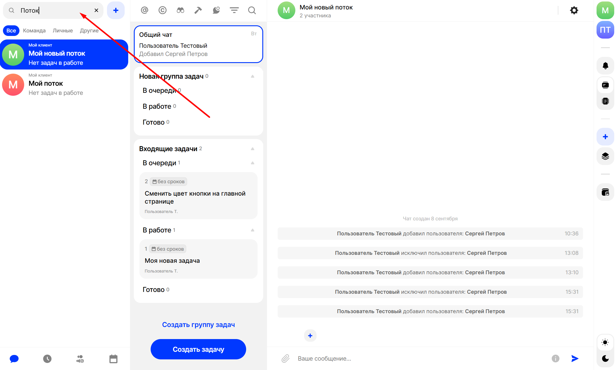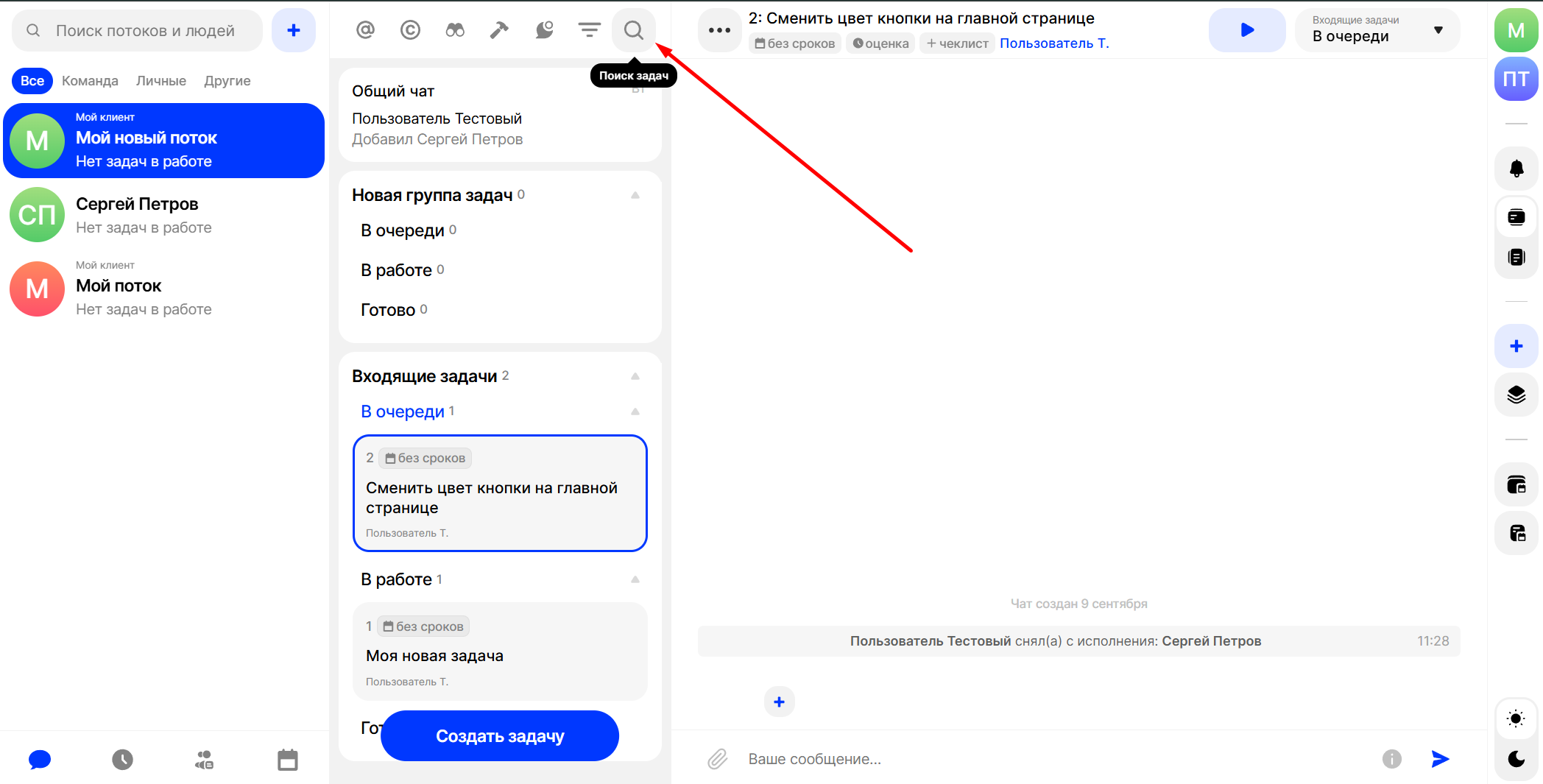 Чтобы в потоке найти определенную задачу, вам нужно в списке задач сверху нажать на кнопку поиска и ввести значение: