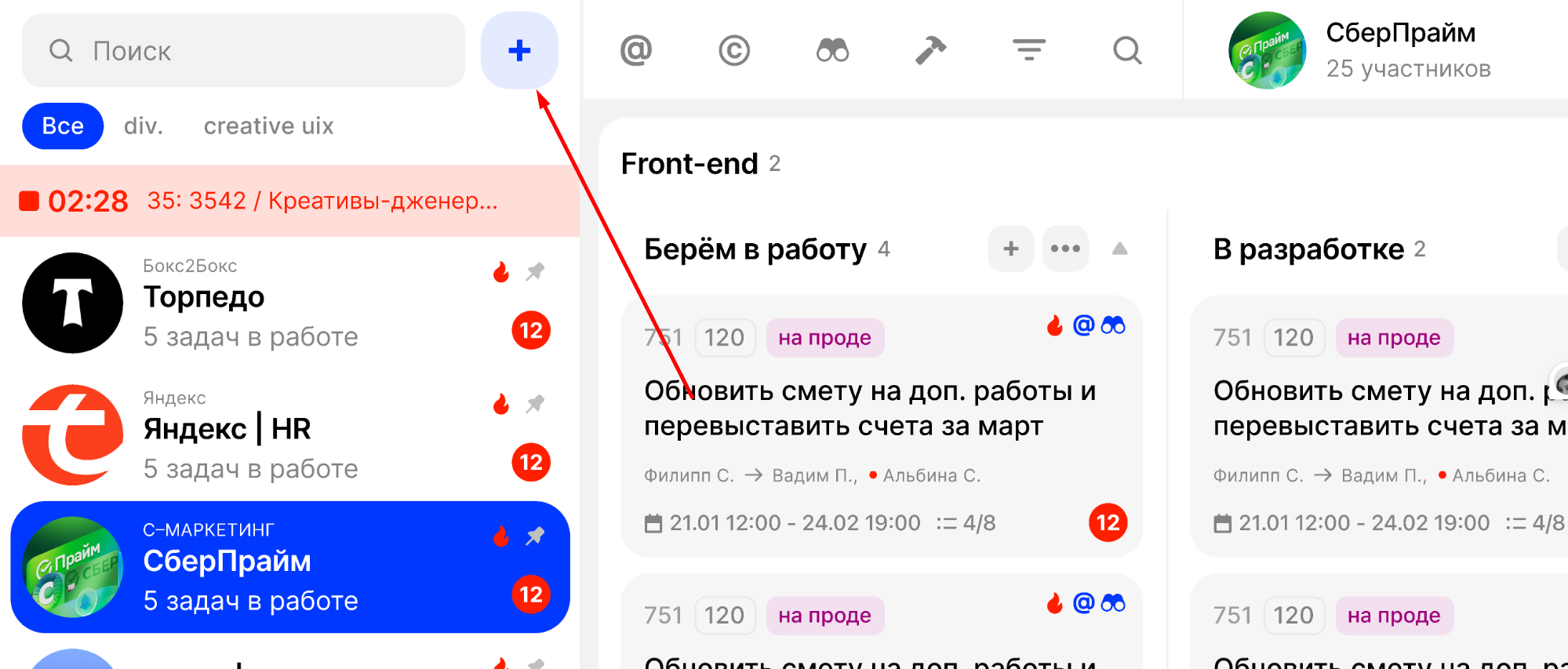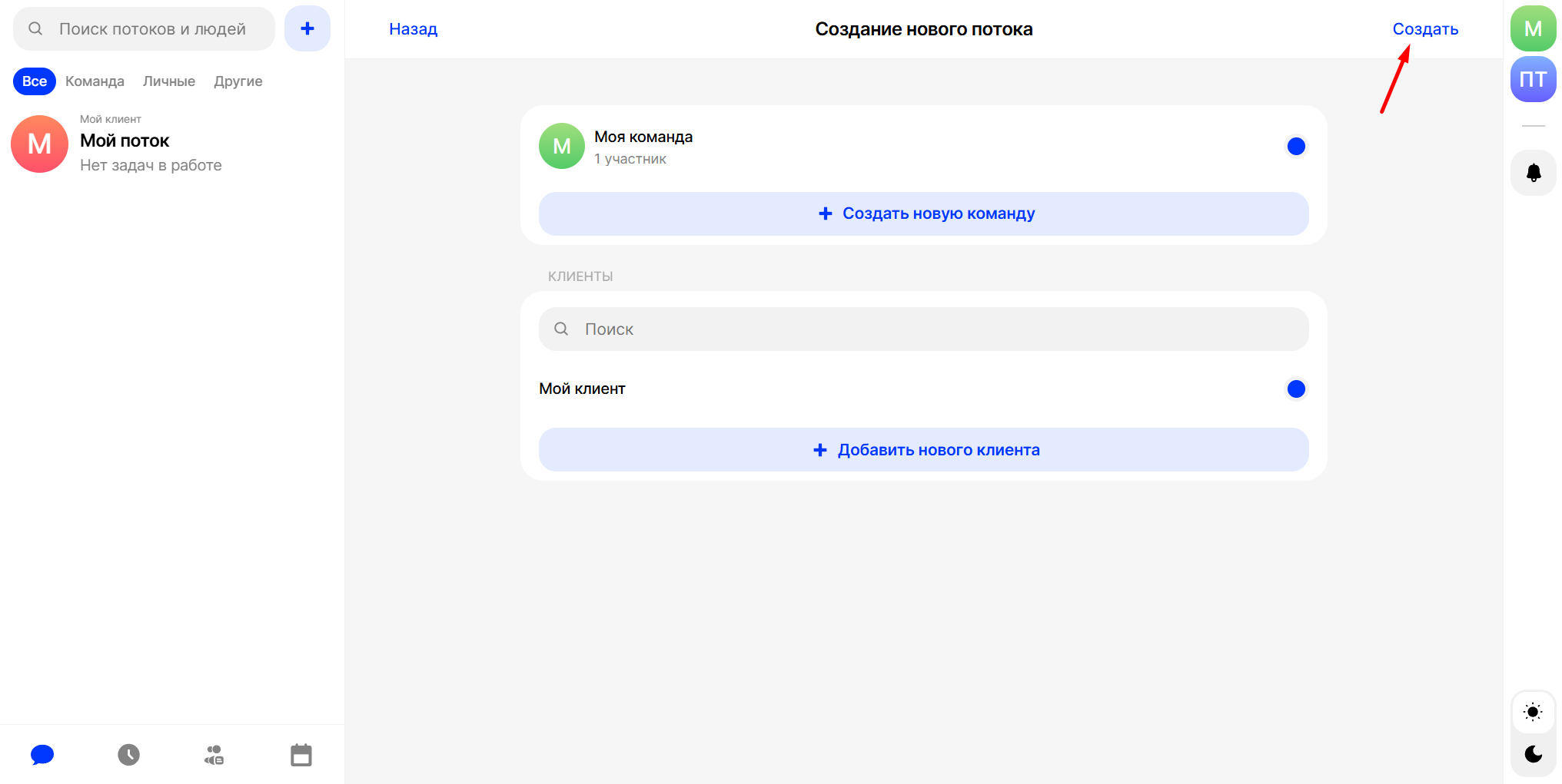 После выбора команды и клиента нажмите на кнопку “Создать” в верхнем правом углу: