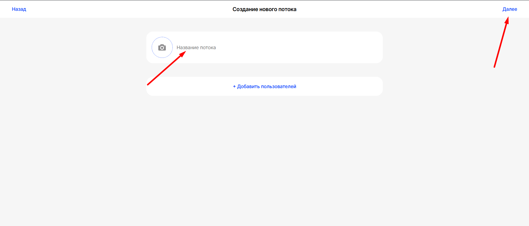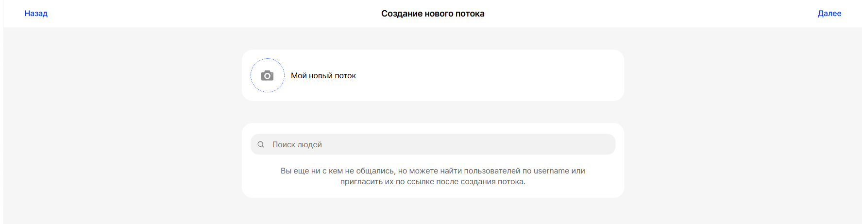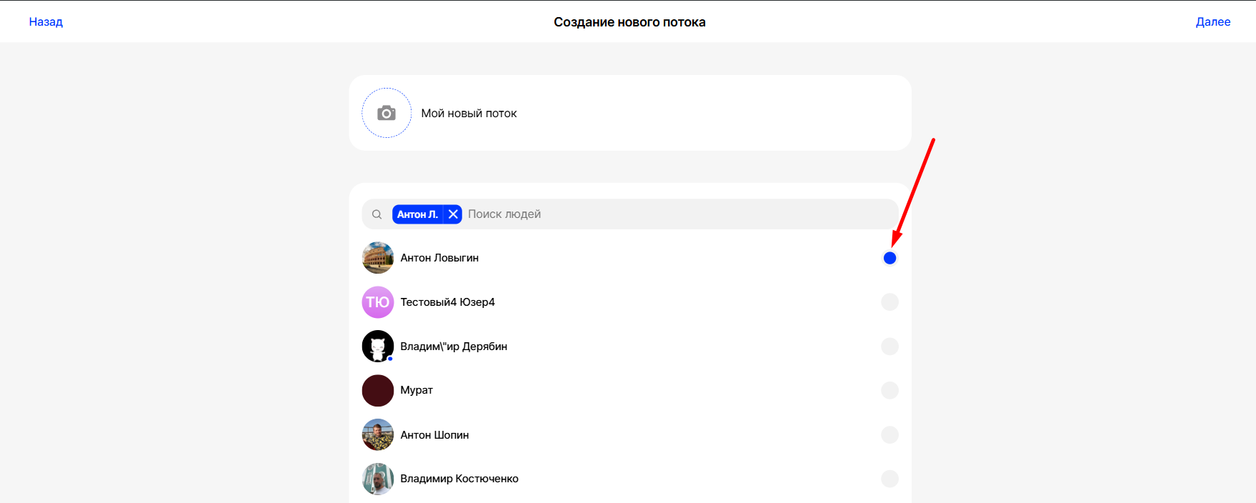 Продолжить создание потока можно и без выбора пользователей, нажав на кнопку "Далее":